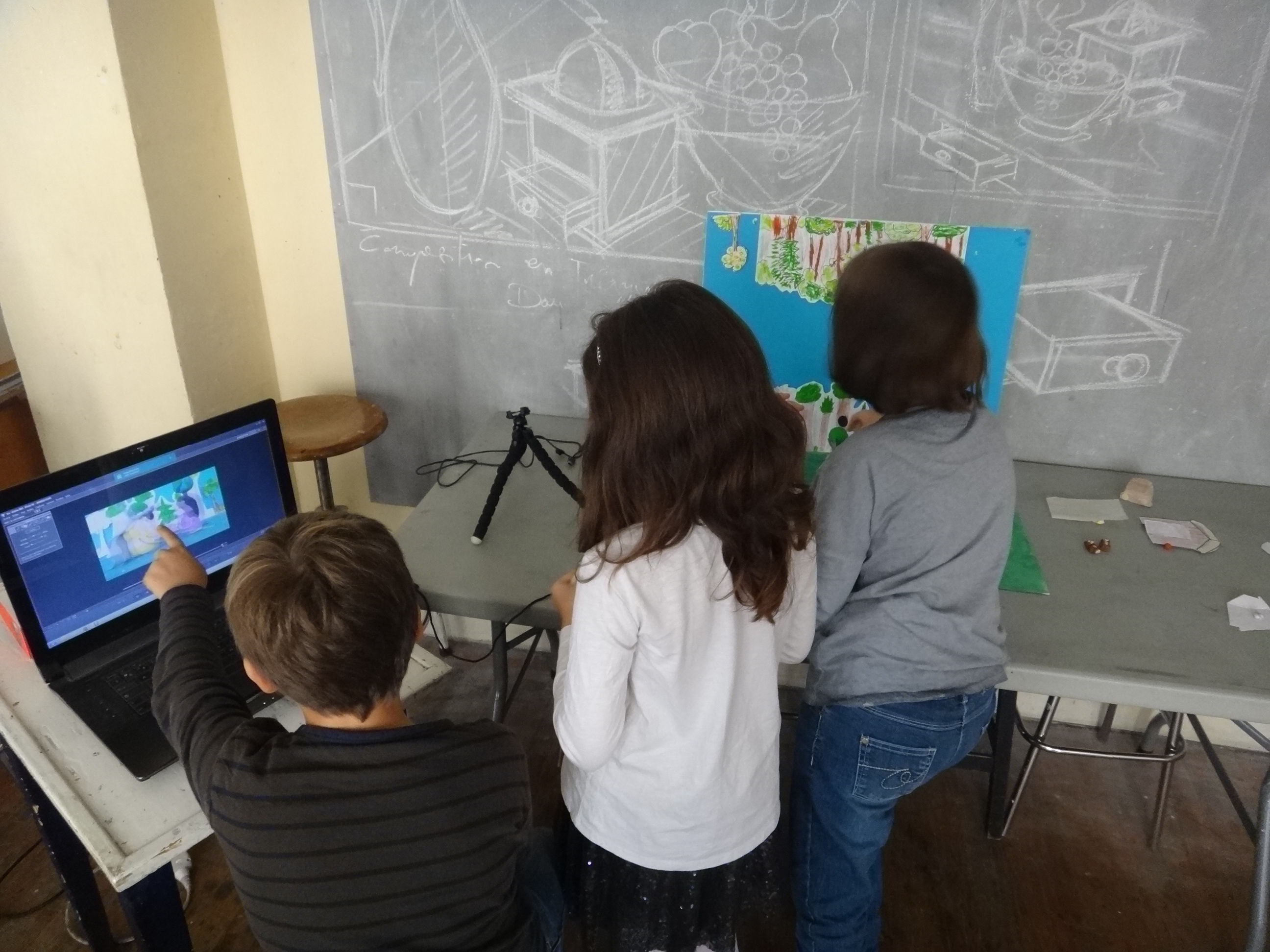 > le film d’animation, qui consiste à donner l’illusion du mouvement à l’aide d’une suite d’image. Les enfants apprennent à réaliser des films par le biais de réalisations individuelles et collectives. Il s’agit donc de créer une histoire et de fabriquer, modeler, découper, colorier les décors et les personnages, de les animer, de réaliser les prises de vue et de sons.